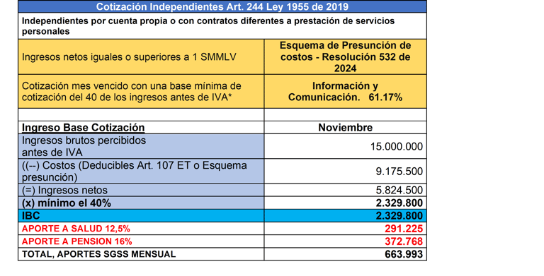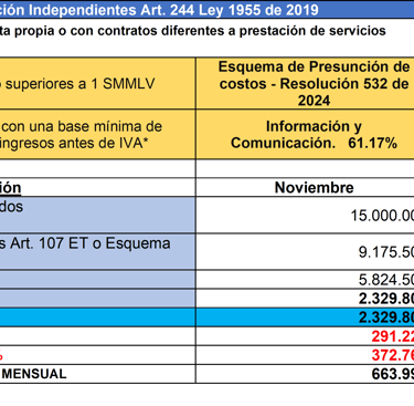 Suponiendo que un independiente recibe ingresos por concepto de actividades de desarrollo de sistemas informáticos (INFORMACIÓN Y COMUNICACIÓN) basándonos en la tabla de la resolución 532 de 2024, tomamos ACTIVIDADES DE INFORMACIÓN Y COMUNICACIÓN correspondiente a el porcentaje 61.17%. (Es importante revisar la equivalencia de la actividad económica del Independiente, según la clasificación CIIU)
