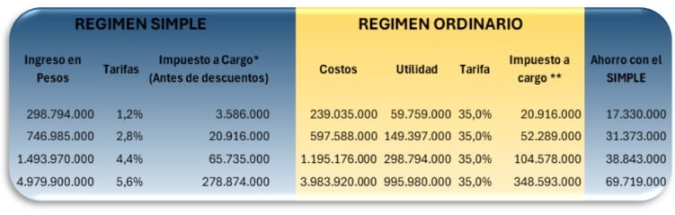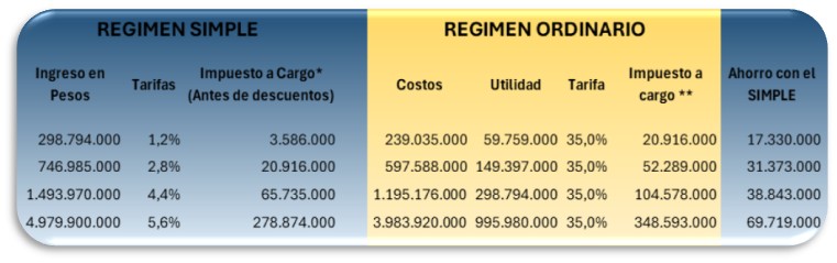 Imaginemos un minimercado clasificado en el Grupo 1, que tenga una utilidad del 20% sobre sus ingresos, calculemos el impuesto a cargo con el SIMPLE su estuviera en el límite mayor de cada uno de los rangos y comparemos con el régimen ordinario con esos mismos ingresos.